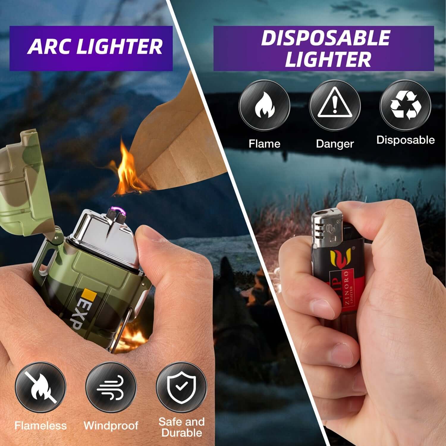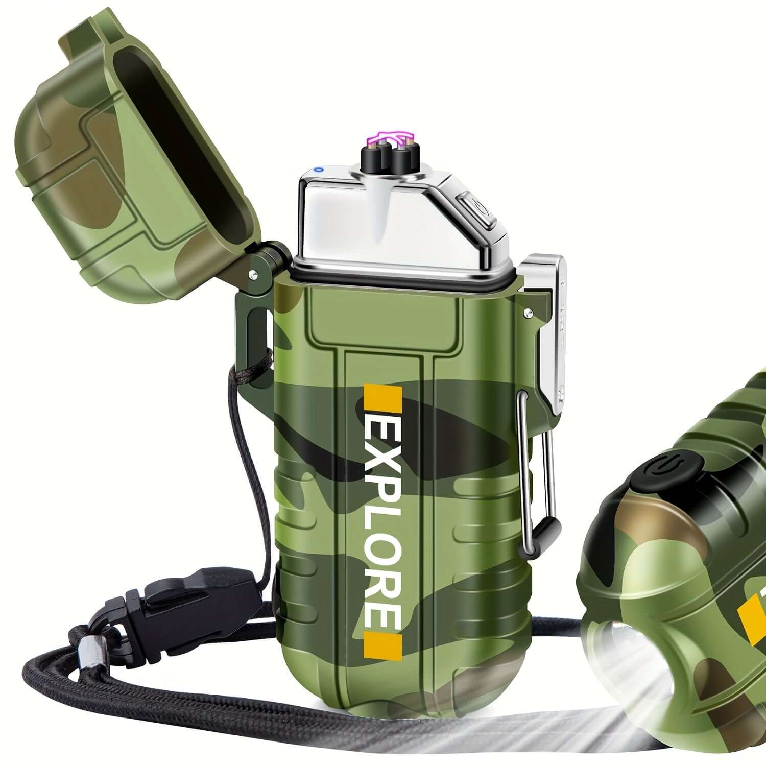 Denna moderna stormtändare med dubbel plasma-båge fungerar i alla väder. Uppladdningsbar via USB, vindtålig och vattentålig. Perfekt för camping, vandring och överlevnadssituationer.